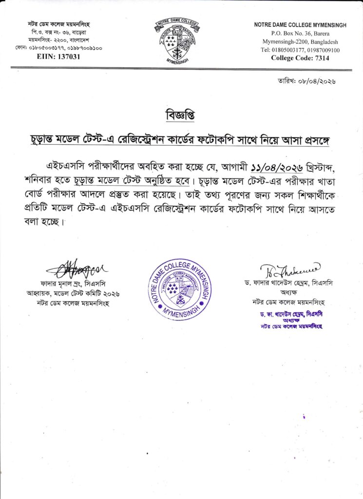 চূড়ান্ত মডেল টেস্ট-এ এইচএসসি রেজিস্ট্রেশন কার্ডের ফটোকপি সাথে নিয়ে আসা প্রসঙ্গেBy admin / April 8, 2026