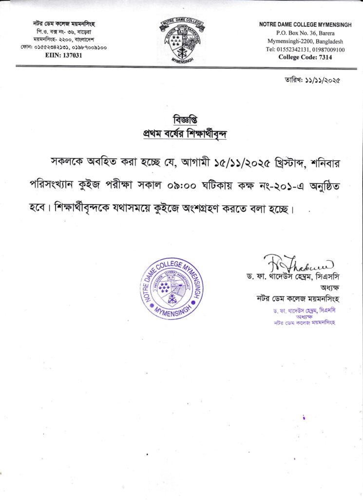 প্রথম বর্ষের পরিসংখ্যান কুইজ পরীক্ষার সময়সূচি এবং কক্ষ পরিবর্তন প্রসঙ্গে