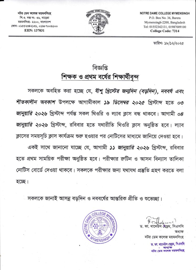 বড়দিন, নববর্ষ ও শীতকালীন অবকাশ উপলক্ষে অফিস বন্ধ প্রসঙ্গে