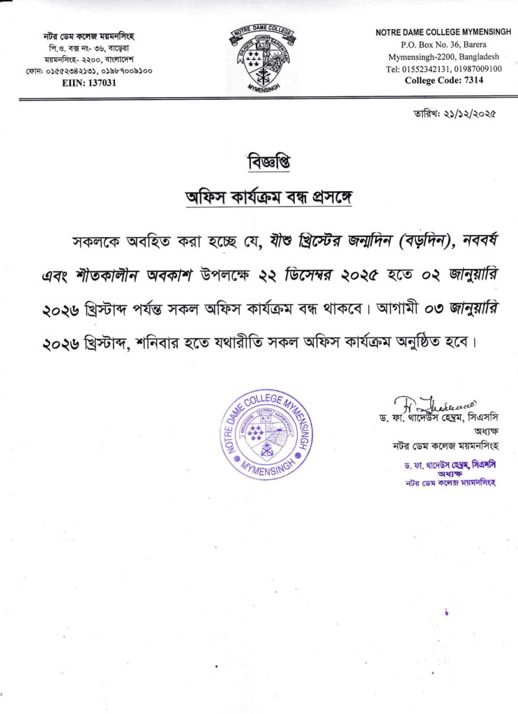বড়দিন, নববর্ষ এবং শীতকালীন অবকাশ উপলক্ষে কলেজ কার্যক্রম বন্ধ প্রসঙ্গে