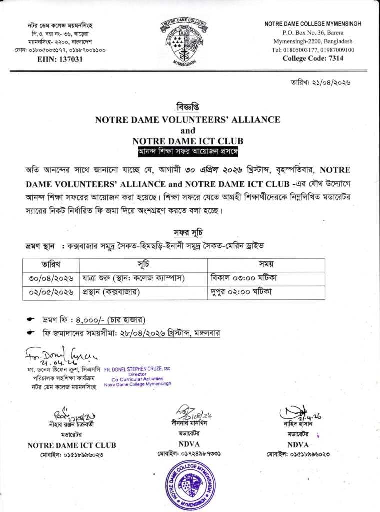 NOTRE DAME VOLUNTEERS’ ALLIANCE and NOTRE DAME ICT CLUB-এর যৌথ উদ্যোগে শিক্ষা সফর আয়োজন প্রসঙ্গেBy admin / April 21, 2026